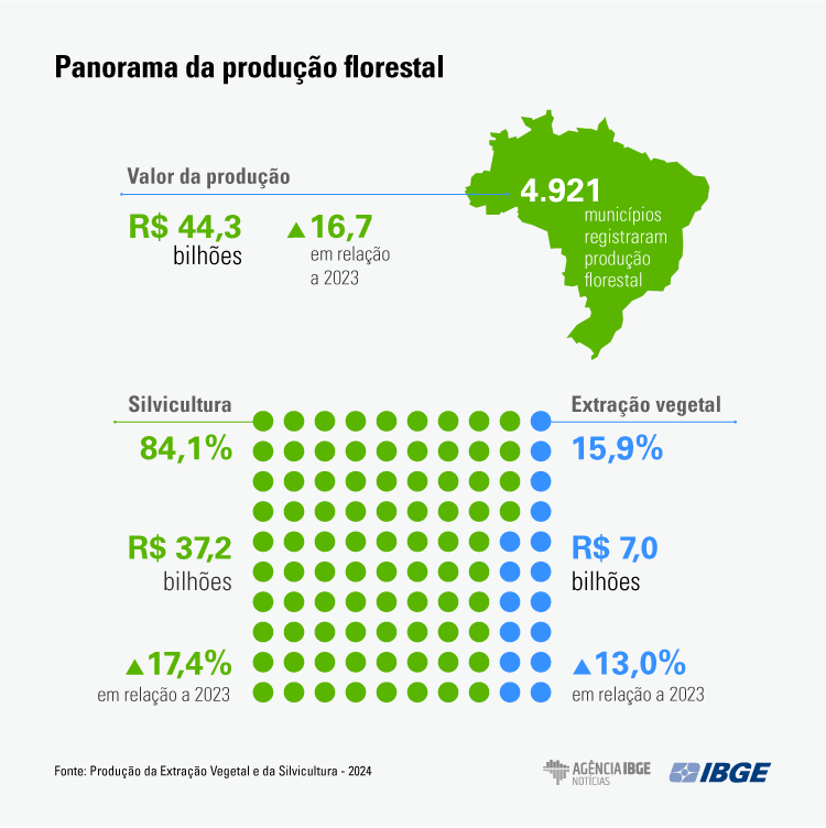 Todo os anos o IBGE divulga dados sobre área, quantidade produzida e valor da produção a partir da exploração de florestas plantadas (silvicultura) e dos recursos vegetais naturais (extrativismo vegetal). Em 2024 o valor da produção florestal atingiu novo recorde, R$ 44,3 bilhões.